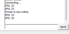 In the top left corner, select the port of the printer(as shown in the device manager) and click connect. The printer should connect and you should see a confirmation message on the right console: